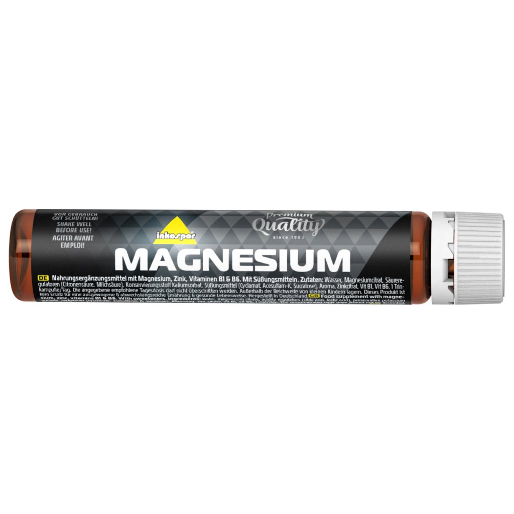 Složení CZ: pitná voda, hořečnaté soli kyseliny citronové, regulátor kyselosti (kyselina citronová, kyselina mléčná), konzervant: sorban draselný, sladidla (kyselina cyklamová a její sodné a vápenaté soli, acesulfam K, sukralosa), aroma, zinečnaté soli kyseliny citronové, thiamin- hydrochlorid, pyridoxin hydrochlorid. Doporučené denní dávkování: 1 ampulka denně. Před použitím dobře protřepte. Nepřekračujte doporučené denní dávkování. Uchovávejte mimo dosah malých dětí. Doplňky stravy nenahrazují pestrou a vyváženou stravu. Chraňte před přímým světlem a uchovávejte při pokojové teplotě. Minimální trvanlivost do konce: viz ampulka. Vyrobeno v Německu.